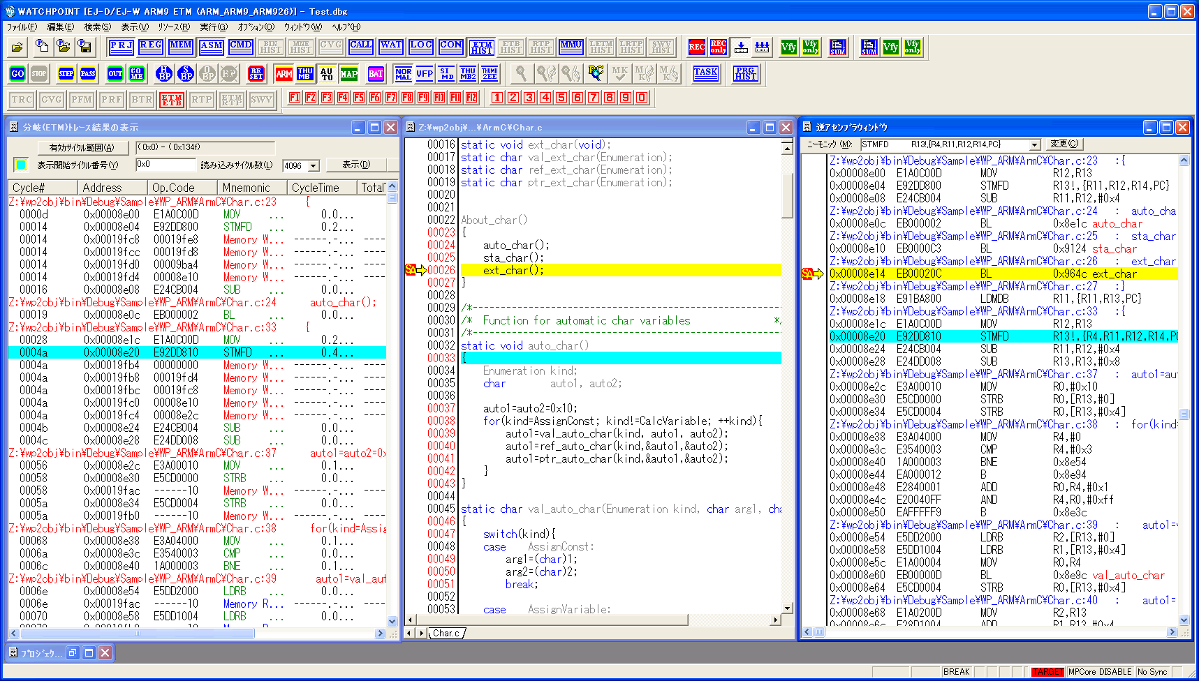 - トレース結果表示内でバーが移動するのと同期してソースウインドウ、逆アセンブラウインドウのバーが 移動するので、プログラムが期待した動きから外れた箇所が容易に見つけられます