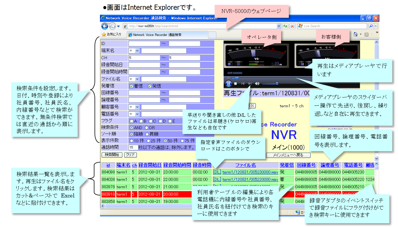 録音保存期間 | HDD容量に閾値を設定し、当日の録音で閾値を越えた場合、閾値内になるまで古い録音から削除し繰り返す |